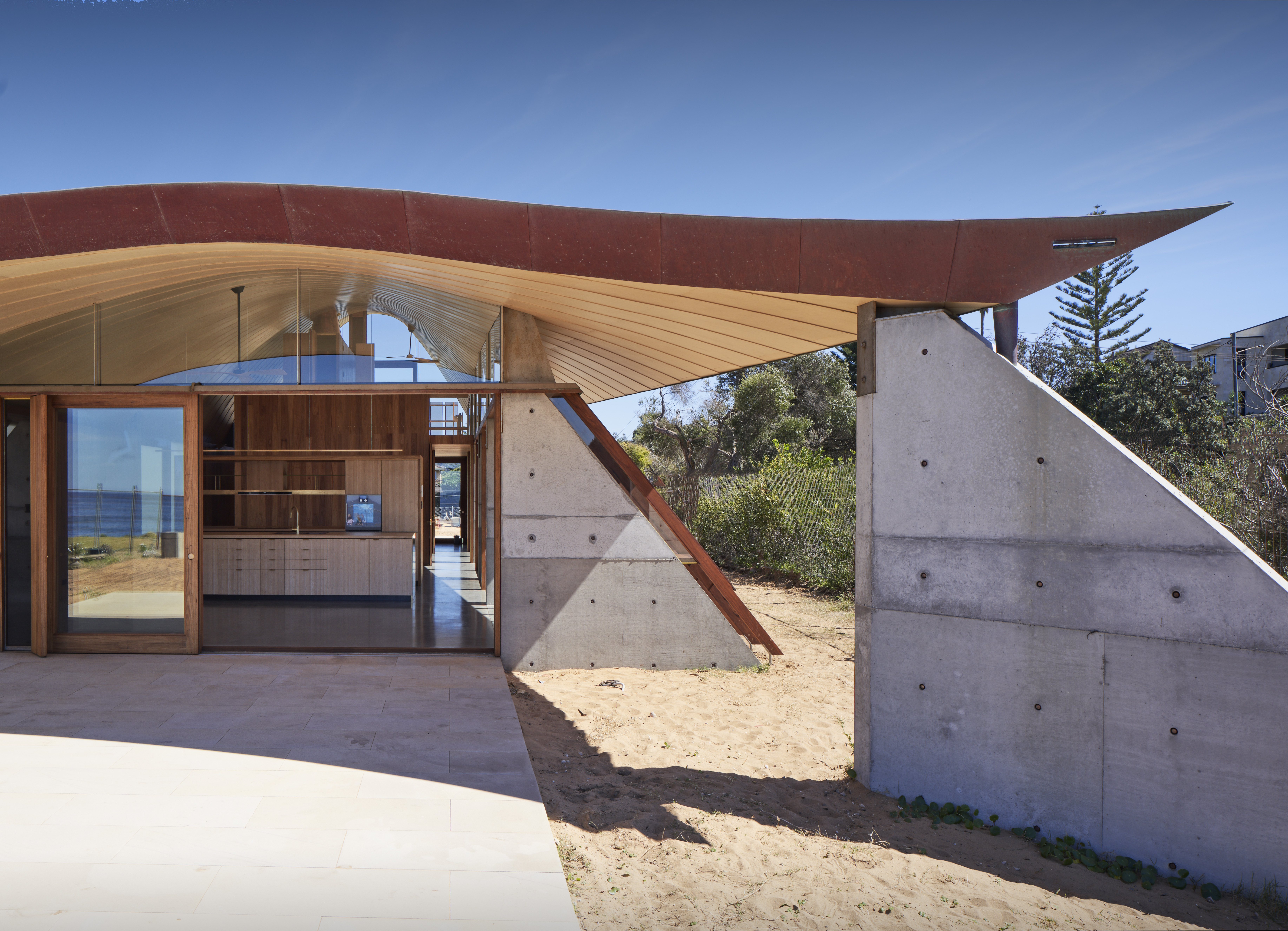 This house featured amazing elements such as a twisting a-symmetrical copper roof, polished concrete floors with Brass infill strips, full copper floor with built-in falls to the upstairs ensuite, hand-turned basins both in clay and in copper, frameless hardwood timber sliding doors that meet with and seal seamlessly to the structure and a feature plywood ceiling of pre-finished panels where no two sheets are cut to the same shape.